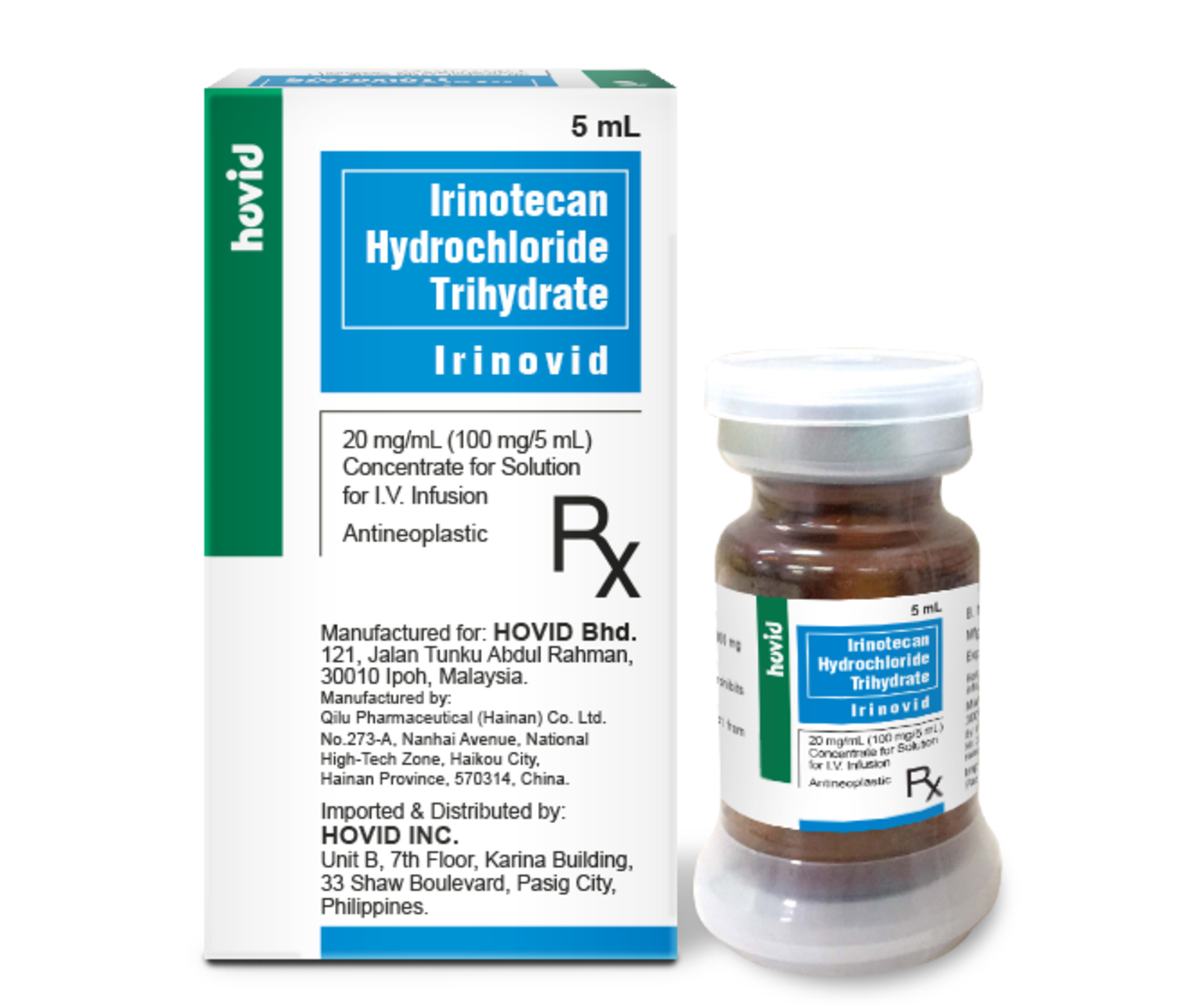 Irinovid (Irinotecan hcl) Pale yellow,clear,aqueous solution each mL of solution contains Irinotecan Hydrochloride Trihydrate 20mg. Each 5mL vial of Irinovid contains 100mg of Irinotecan Hydrochloride Trihydrate. it is an Antineoplastic agent. it is indicated for the treatment in patients with